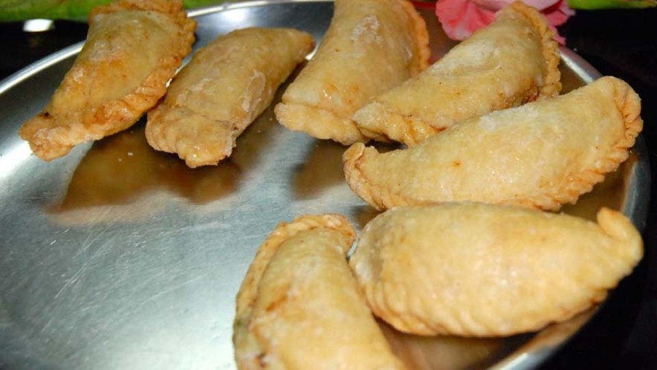 Pendant les festivités, les familles préparent aussi des gujiyas. Ce sont des pâtisseries frites remplies de fruits secs, de noix et de khoya, du lait évaporé sucré utilisé dans des desserts d'Asie du Sud.😋