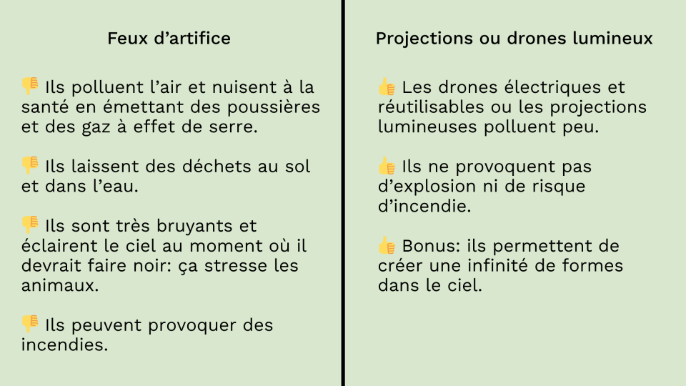 Les feux d’artifice ont été inventés en Chine il y a plus de 1000 ans. Aujourd’hui, ils sont utilisés partout dans le monde pour célébrer des moments importants: les fêtes nationales, le changement d’année, des championnats sportifs... Mais ces petits explosifs, faits de poudre noire et de sels métalliques (qui créent les couleurs), ne sont pas très bons pour l’environnement.