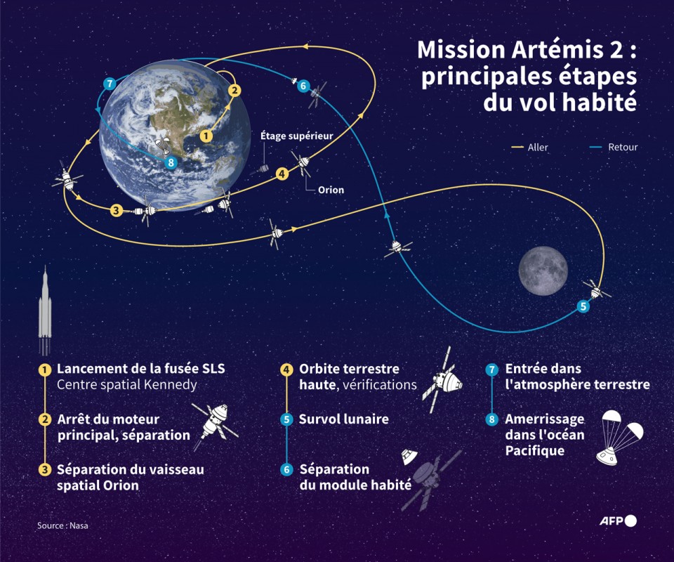 Sur cette image, on voit les principales étapes de la mission Artemis II.