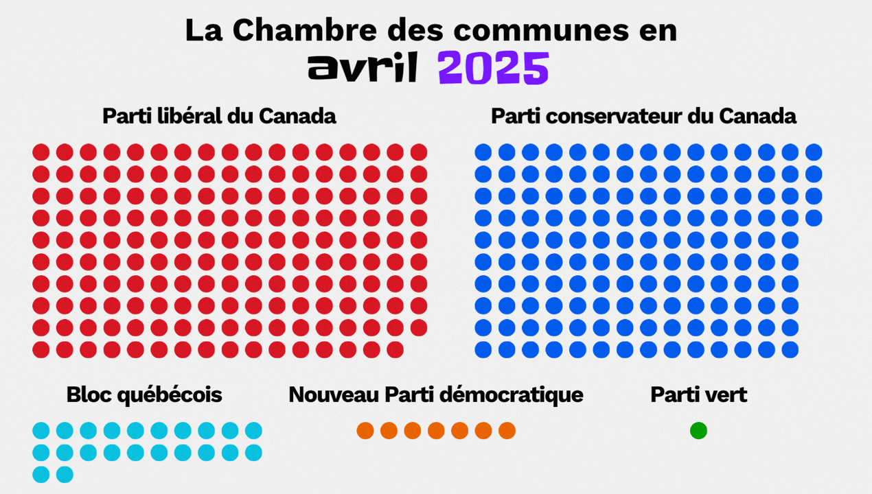 Les dernières élections fédérales ont eu lieu en avril 2025. C’est le Parti libéral du Canada (PLC), dont le chef est Mark Carney, qui a gagné. À l’époque, il a fait élire 169 députés. Ce n’était pas le scénario idéal pour un parti. Pourquoi? Parce que ça voulait dire qu’il allait former un gouvernement minoritaire.