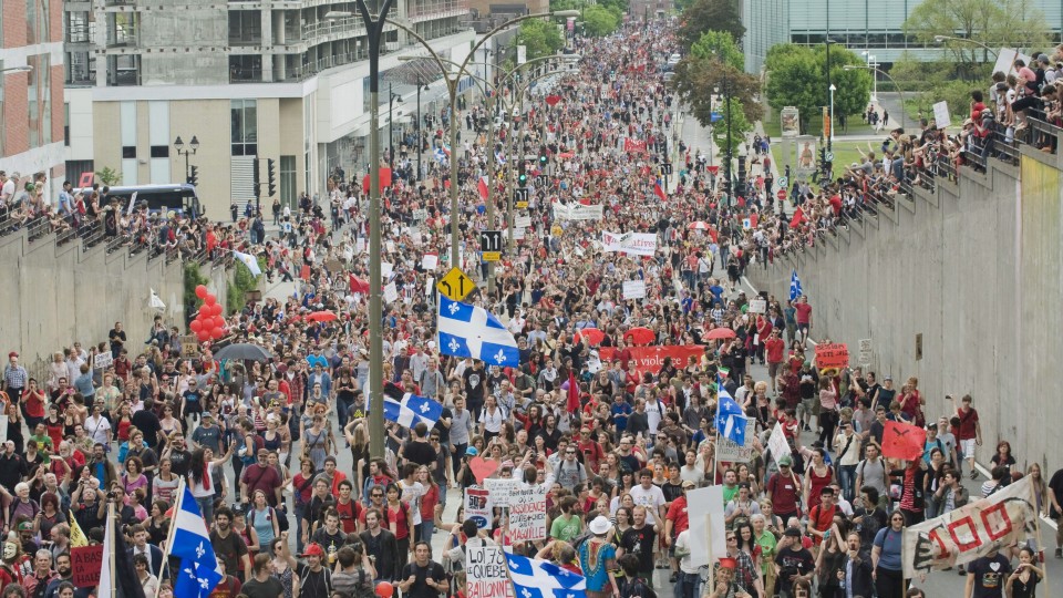 À l’époque, des milliers d’étudiants québécois ont fait la grève pour protester contre une hausse des frais de scolarité annoncée par le gouvernement libéral de Jean Charest. Une grande partie de la population du Québec a soutenu les étudiants en descendant dans les rues pour protester avec eux. Le carré rouge représentait l’idée d’être «carrément dans le rouge», c’est-à-dire d’avoir des dettes.